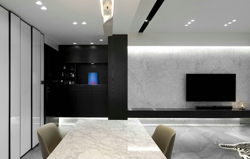 如果是明装射灯,可以选择轨道射灯,射灯头数量和位置都可以随意改变,轨道也可以摆个造型,增加时尚感。筒灯也可以暗装和明装,光线下射,相对于普通明装的灯具更具有聚光性,光源一般不可调节,可做普通照明和辅助照明,更容易营造温馨柔和的氛围。 不仅可以在客厅做无主灯设计,厨房、卧室、餐厅、卫生间都可以做无主灯设计,非常的实用又有颜值。