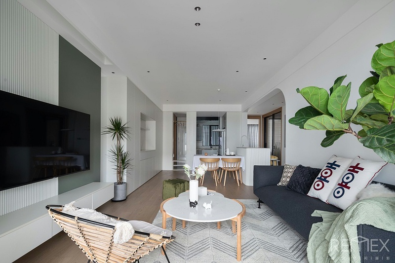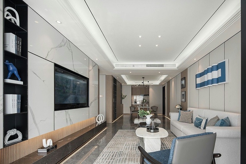 1.采用嵌入式筒灯组合,搭配电视墙感应灯带,为整体空间营造简单温暖的氛围。