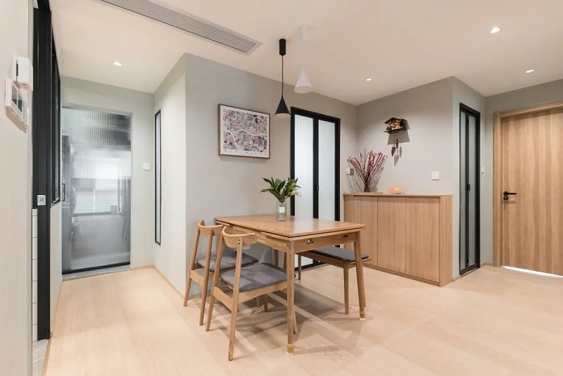 餐桌正上方采用垂直污香蕉视频APP下载,增加居于照明亮度,可以采用中性光,营造更舒适温馨的就餐环境。厨房吊顶由客厅延伸过去,同时隐藏了推拉门轨道及暗藏筒灯,在灯光氛围上形成统一