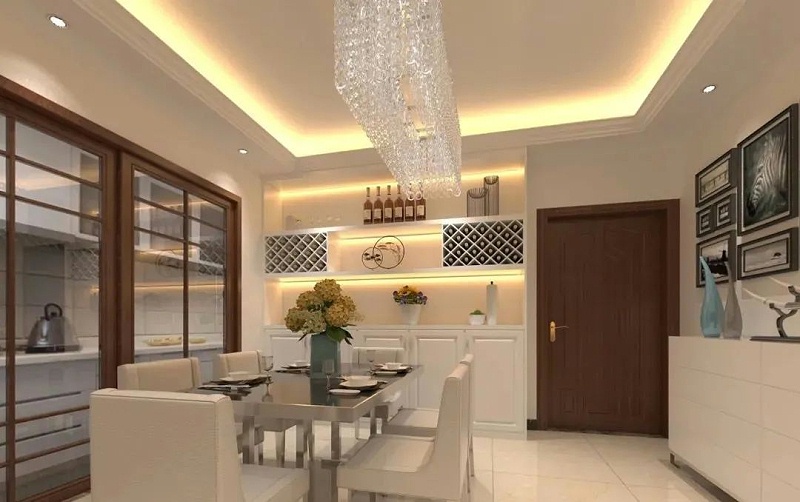 这个餐厅的空间比较大,如果单凭一盏水晶污香蕉视频APP下载是满足不了餐厅的光线亮度的,因为水晶污香蕉视频APP下载的灯光照射范围有限,所以需要借助一些补光灯来提高亮度,而吊顶中的灯带恰好是补光灯,它不仅照亮了吊顶,而且也照亮了餐厅的角落,水晶污香蕉视频APP下载更多的是起到了一种装饰和美化环境的作用,而它的照明能力是非常有限的! 如果你家餐厅空间较大,又担心主光源曝光不足,那就可以借助吊顶灯带来解决这个问题,既美观又实用。